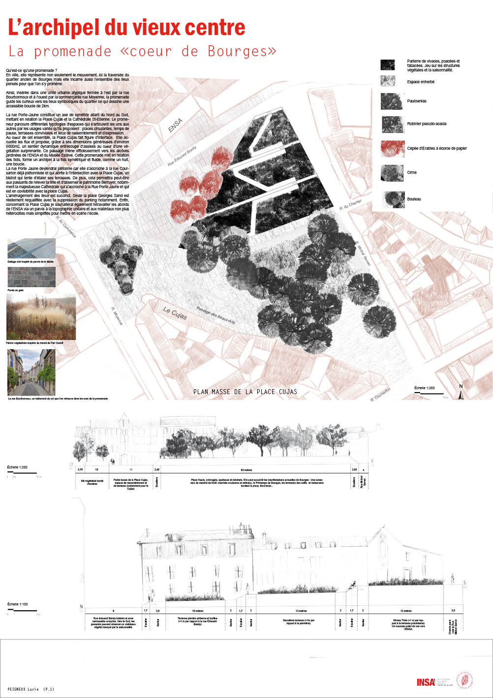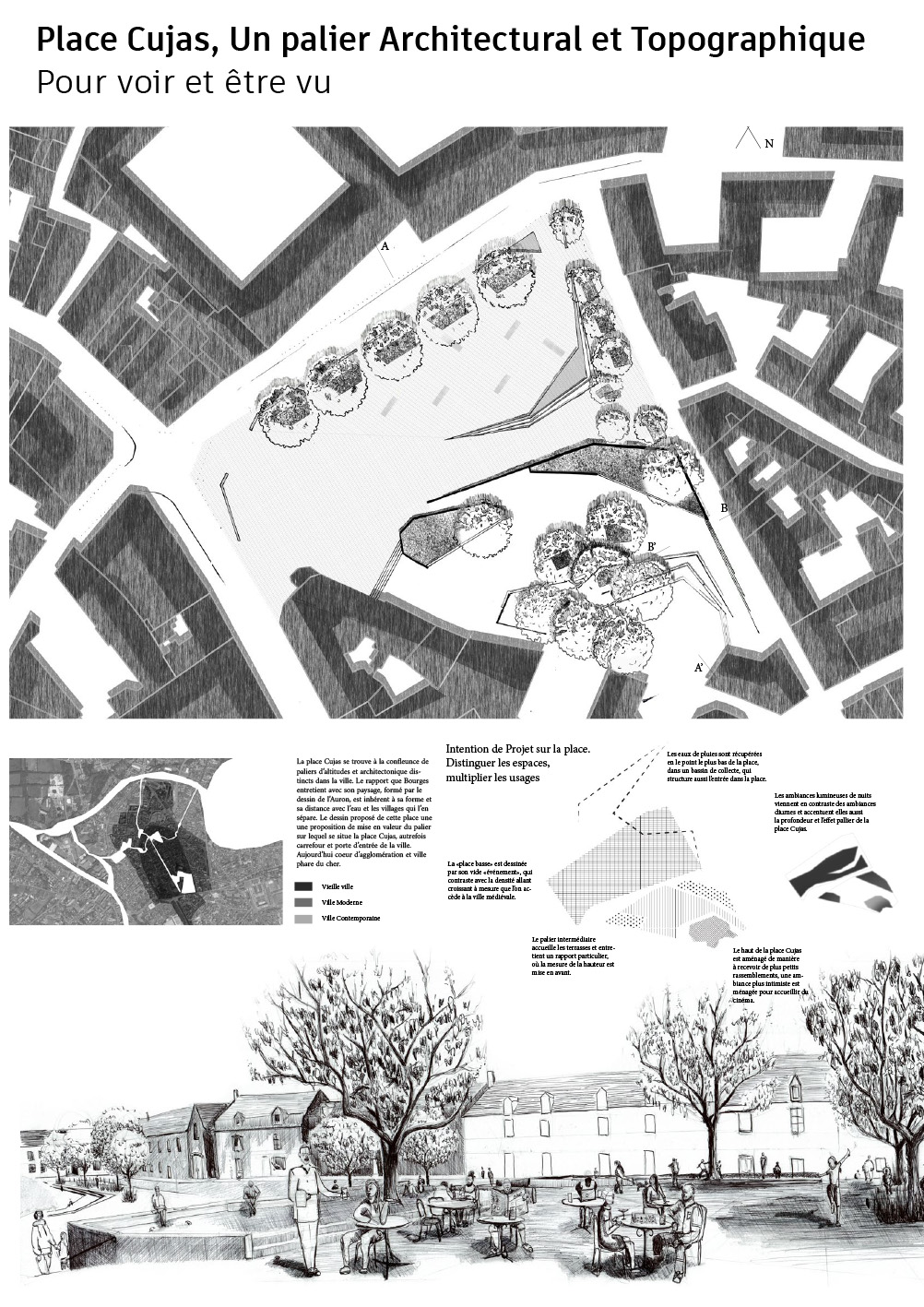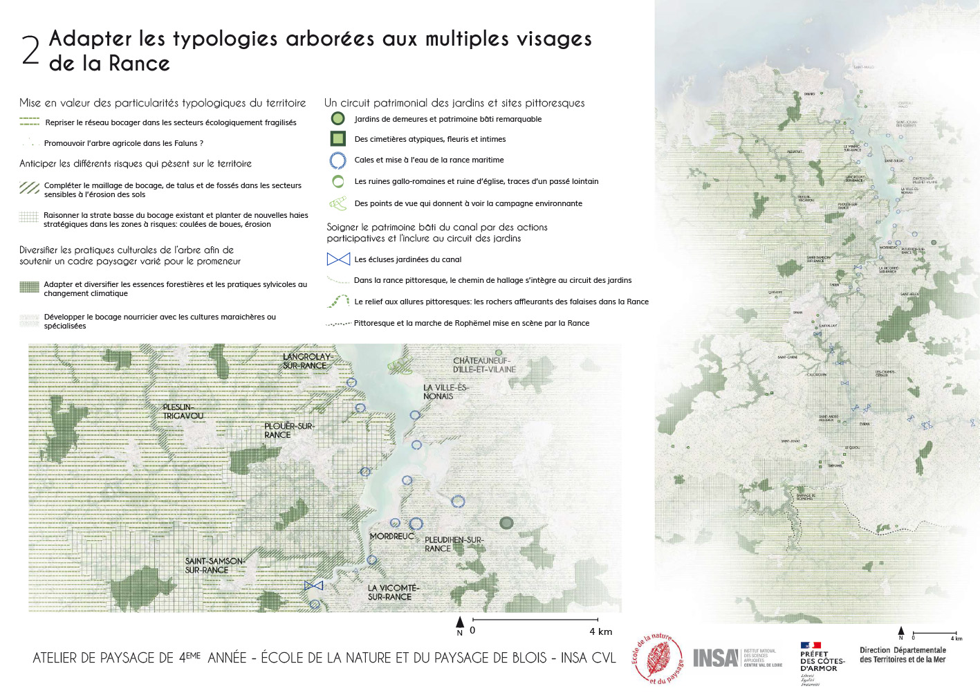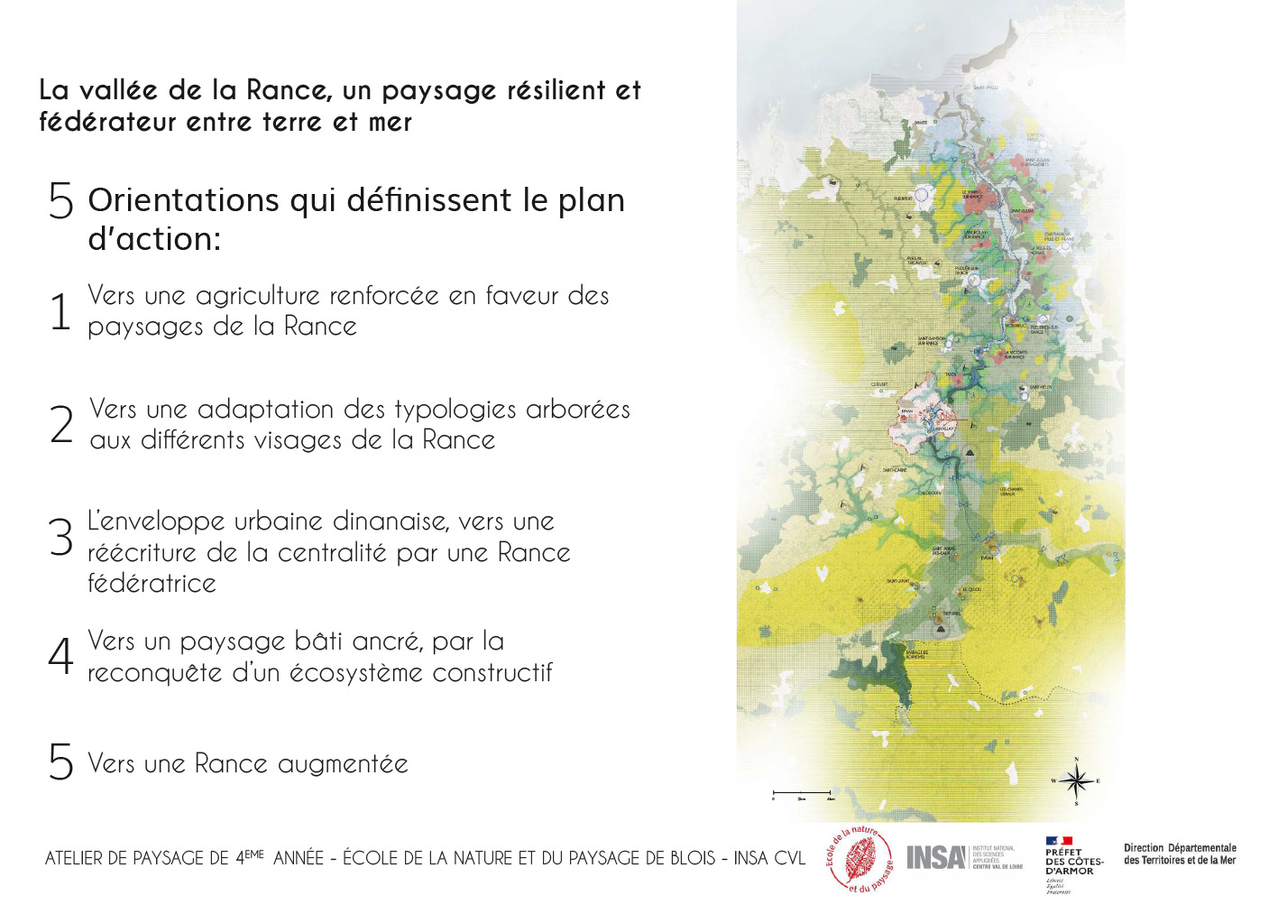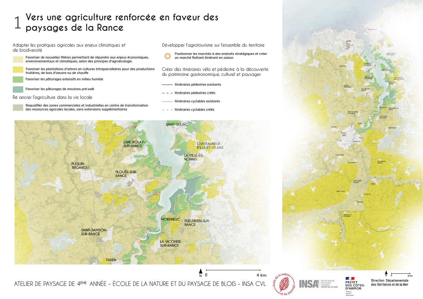 Tous les vendredis, c’est atelier de projet à l’école, pour toutes les promotions. L’atelier de projet en cycle de DEP s’organise autour de conventions que nous établissons avec des partenaires publics ; leurs questionnements deviennent pour les élèves des situations, qui, si elles ne sont pas des commandes réelles, n’en demeurent pas moins des projets réalistes. Partant d’une commande, les élèves et leurs enseignants reformulent les problèmes, définissent une stratégie d’ensemble et répondent collectivement, par autant de propositions de projet de paysage qu’il y a d’élèves, aux questions posées. Récemment, nous avons accompagné la ville de Bourges sur la redéfinition de la place Cujas, la ville de Blois pour un vaste de projet de désimperméabilisation de la ville pour lutter contre les îlots de chaleur urbains, nous avons répondu à la Communauté d’Agglomération de Rochefort pour les soutenir face à la transition énergétique, au Pays des Châteaux (Blois Chambord) pour les aider dans la définition de leur Projet Alimentaire Territorial, à l’Agglomération de Dinan sur leur démarche paysagère agricole, dans le cadre d’enjeux forts d’érosion.