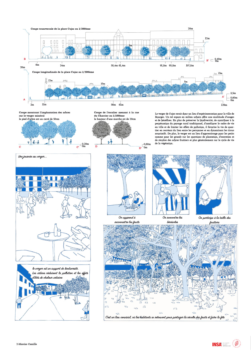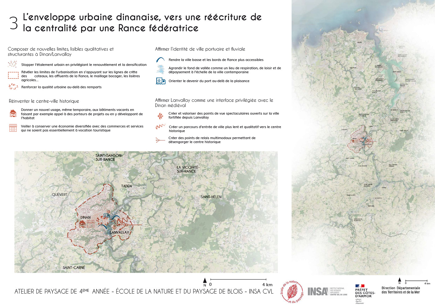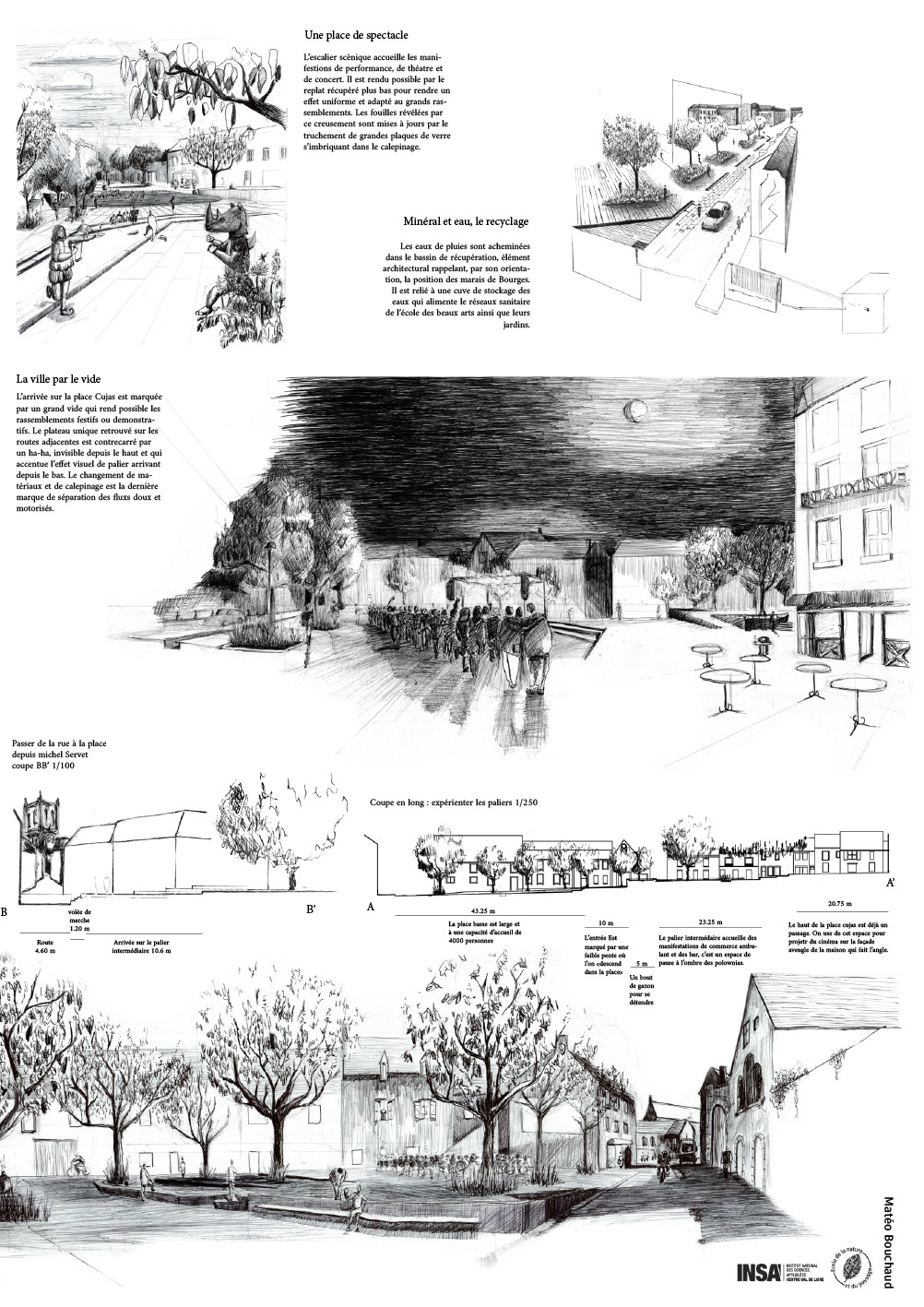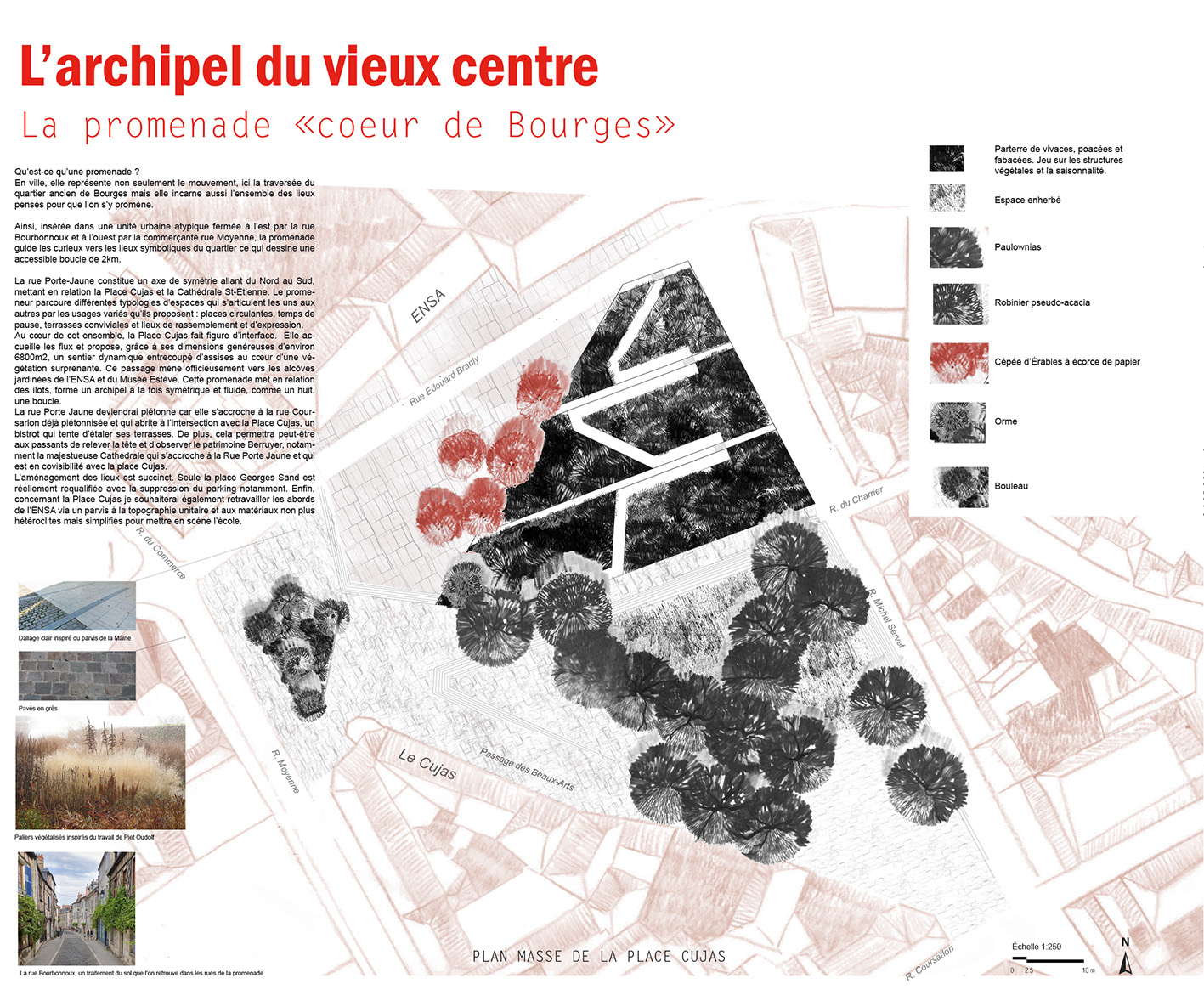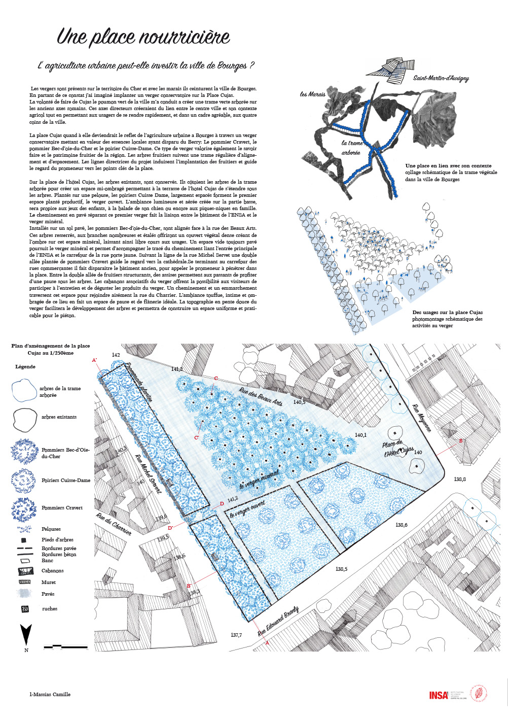 Tous les vendredis, c’est atelier de projet à l’école, pour toutes les promotions. L’atelier de projet en cycle de DEP s’organise autour de conventions que nous établissons avec des partenaires publics ; leurs questionnements deviennent pour les élèves des situations, qui, si elles ne sont pas des commandes réelles, n’en demeurent pas moins des projets réalistes. Partant d’une commande, les élèves et leurs enseignants reformulent les problèmes, définissent une stratégie d’ensemble et répondent collectivement, par autant de propositions de projet de paysage qu’il y a d’élèves, aux questions posées. Récemment, nous avons accompagné la ville de Bourges sur la redéfinition de la place Cujas, la ville de Blois pour un vaste de projet de désimperméabilisation de la ville pour lutter contre les îlots de chaleur urbains, nous avons répondu à la Communauté d’Agglomération de Rochefort pour les soutenir face à la transition énergétique, au Pays des Châteaux (Blois Chambord) pour les aider dans la définition de leur Projet Alimentaire Territorial, à l’Agglomération de Dinan sur leur démarche paysagère agricole, dans le cadre d’enjeux forts d’érosion.