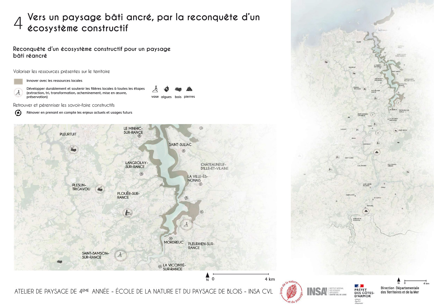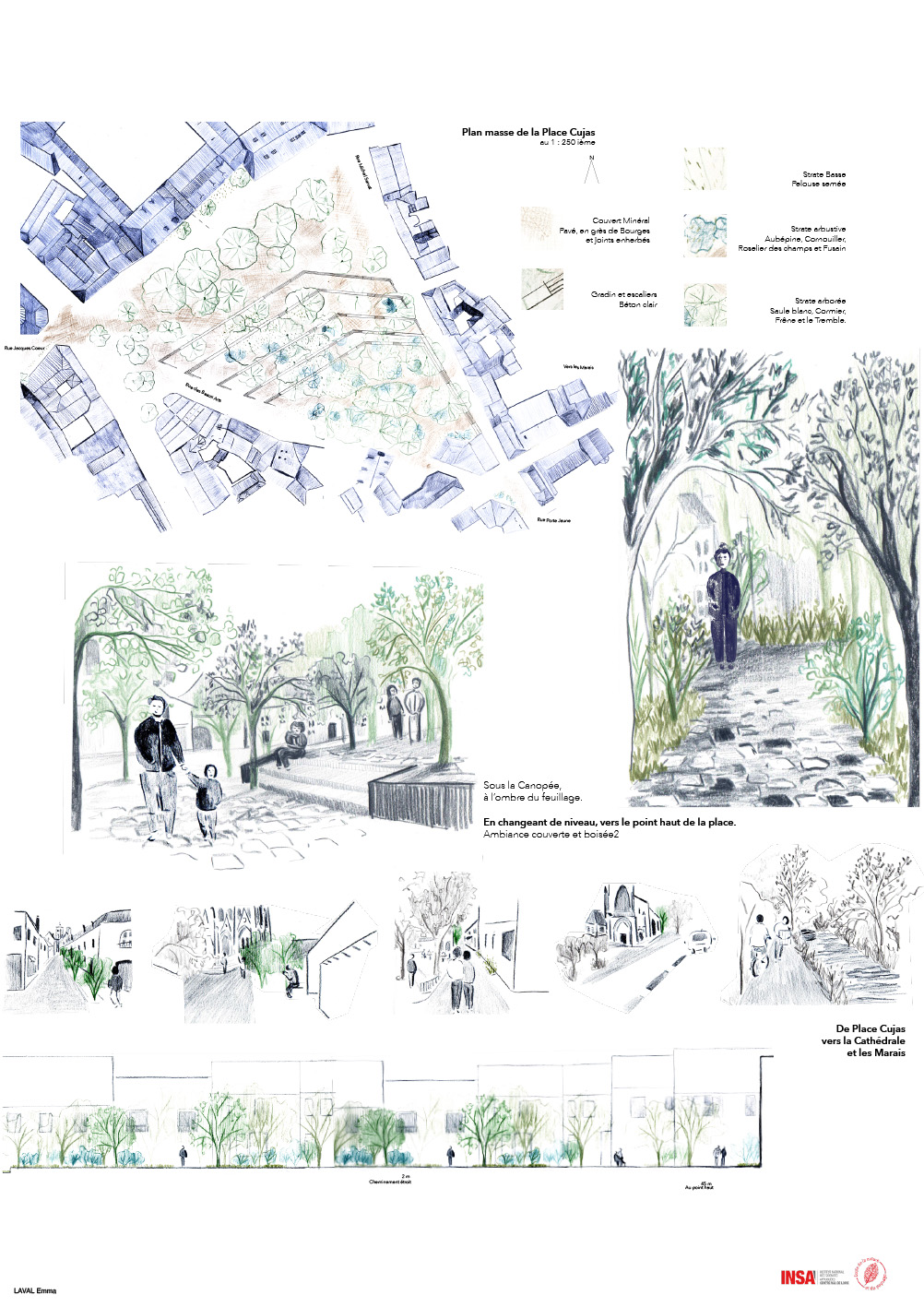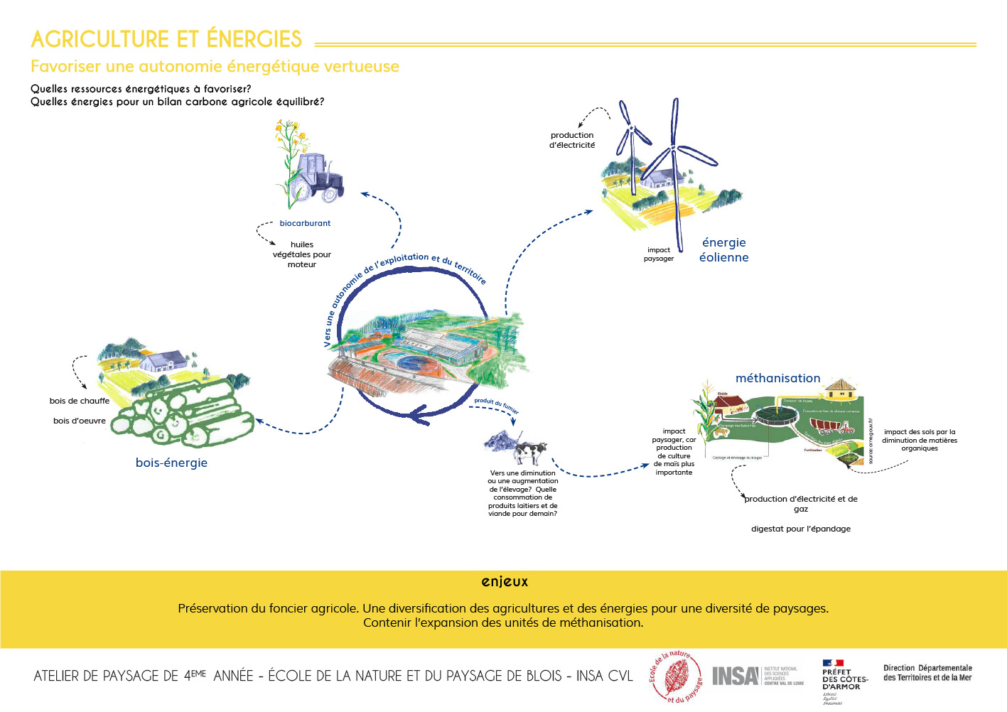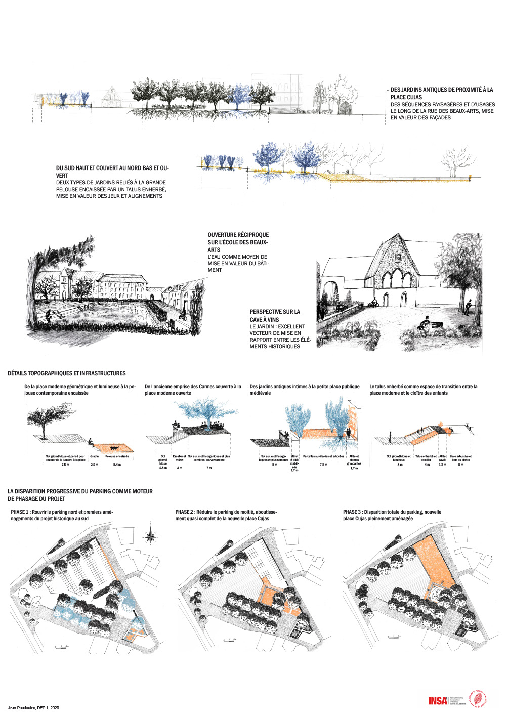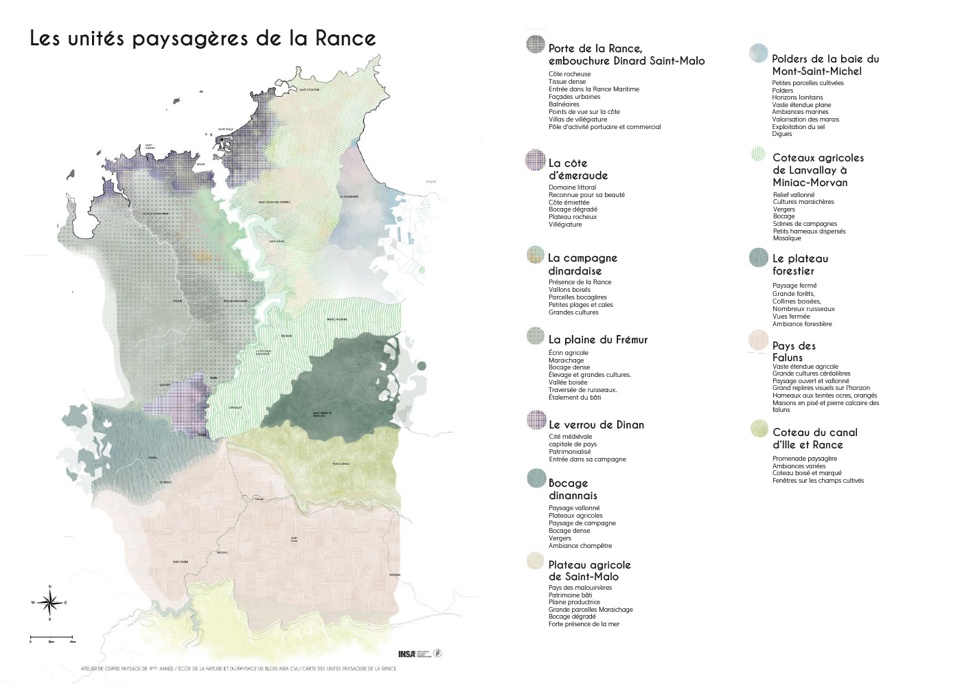 Tous les vendredis, c’est atelier de projet à l’école, pour toutes les promotions. L’atelier de projet en cycle de DEP s’organise autour de conventions que nous établissons avec des partenaires publics ; leurs questionnements deviennent pour les élèves des situations, qui, si elles ne sont pas des commandes réelles, n’en demeurent pas moins des projets réalistes. Partant d’une commande, les élèves et leurs enseignants reformulent les problèmes, définissent une stratégie d’ensemble et répondent collectivement, par autant de propositions de projet de paysage qu’il y a d’élèves, aux questions posées. Récemment, nous avons accompagné la ville de Bourges sur la redéfinition de la place Cujas, la ville de Blois pour un vaste de projet de désimperméabilisation de la ville pour lutter contre les îlots de chaleur urbains, nous avons répondu à la Communauté d’Agglomération de Rochefort pour les soutenir face à la transition énergétique, au Pays des Châteaux (Blois Chambord) pour les aider dans la définition de leur Projet Alimentaire Territorial, à l’Agglomération de Dinan sur leur démarche paysagère agricole, dans le cadre d’enjeux forts d’érosion.