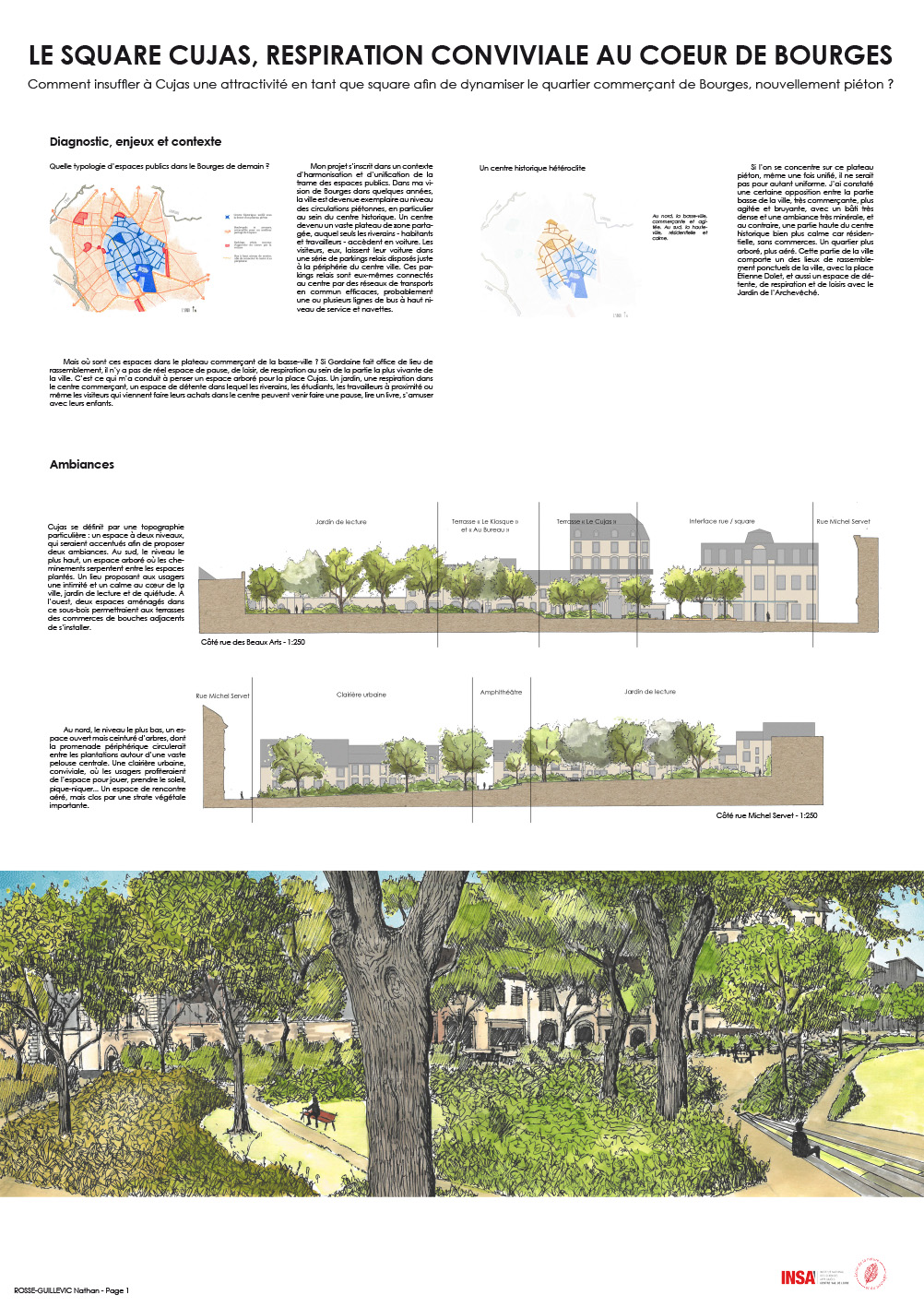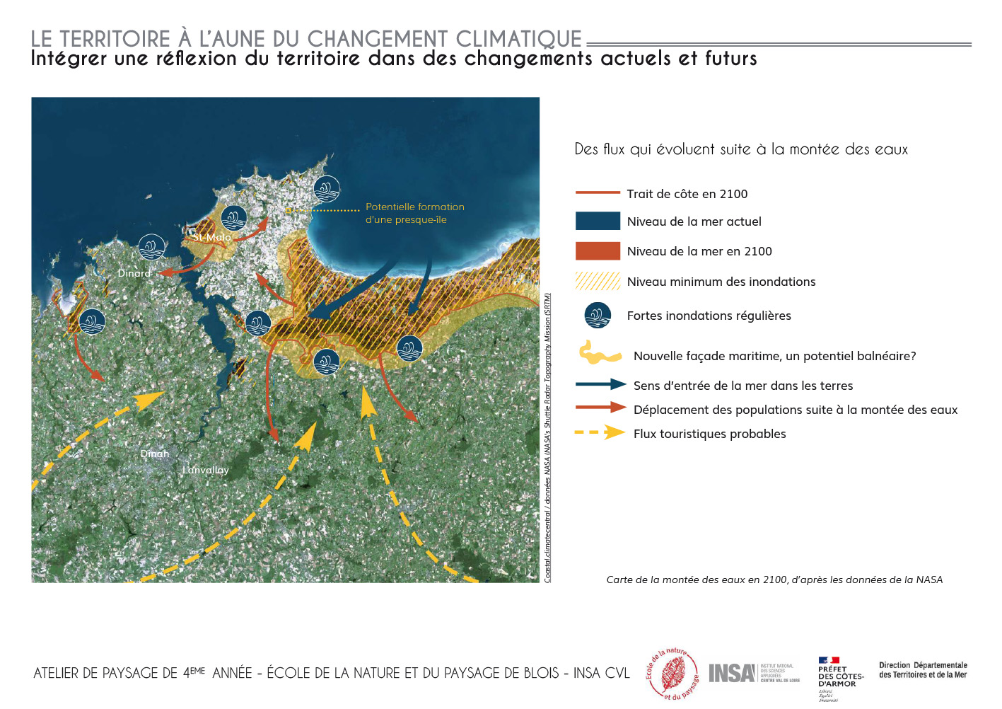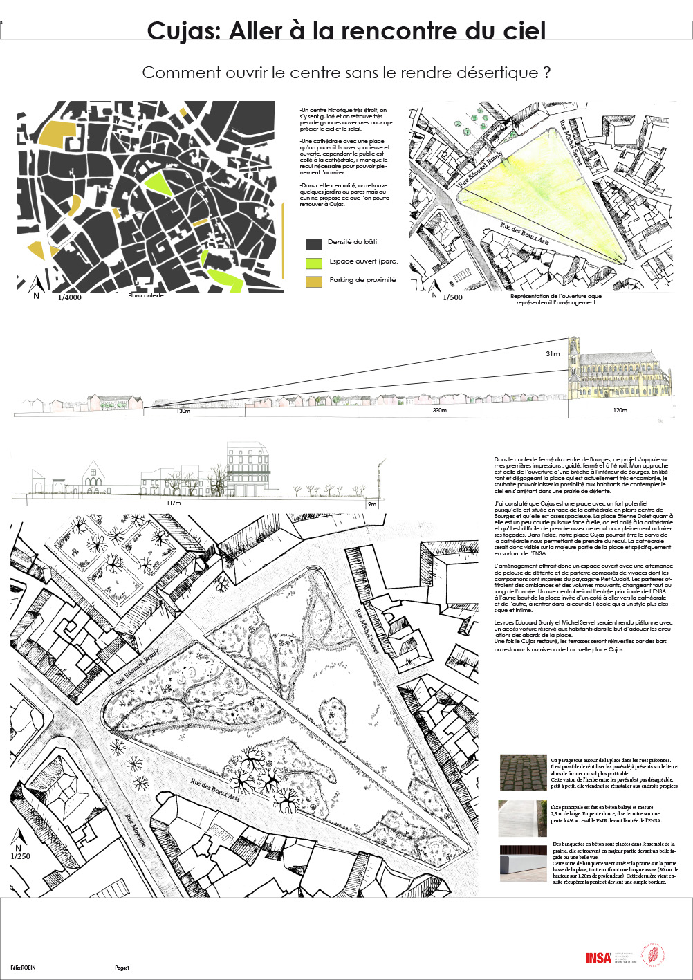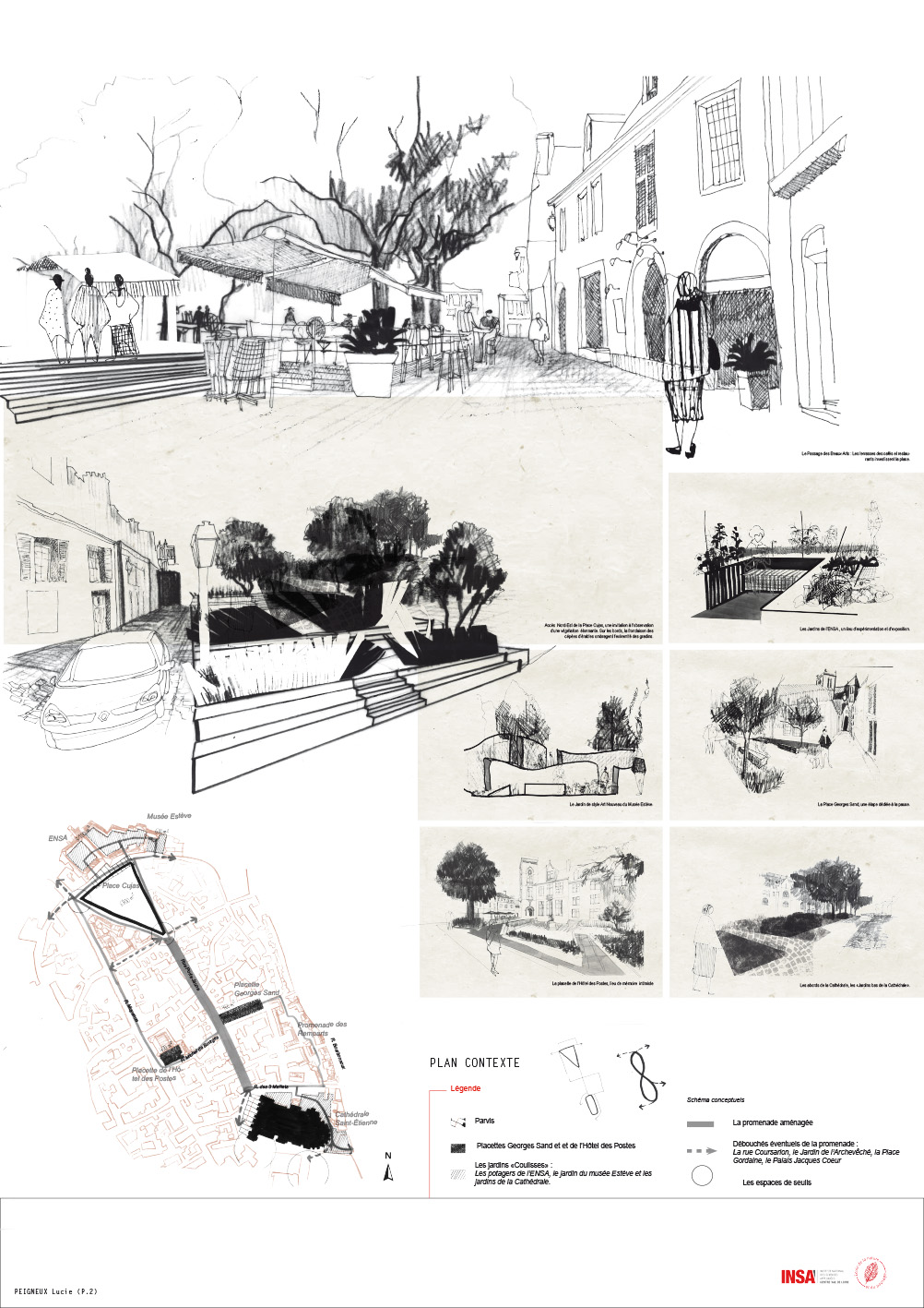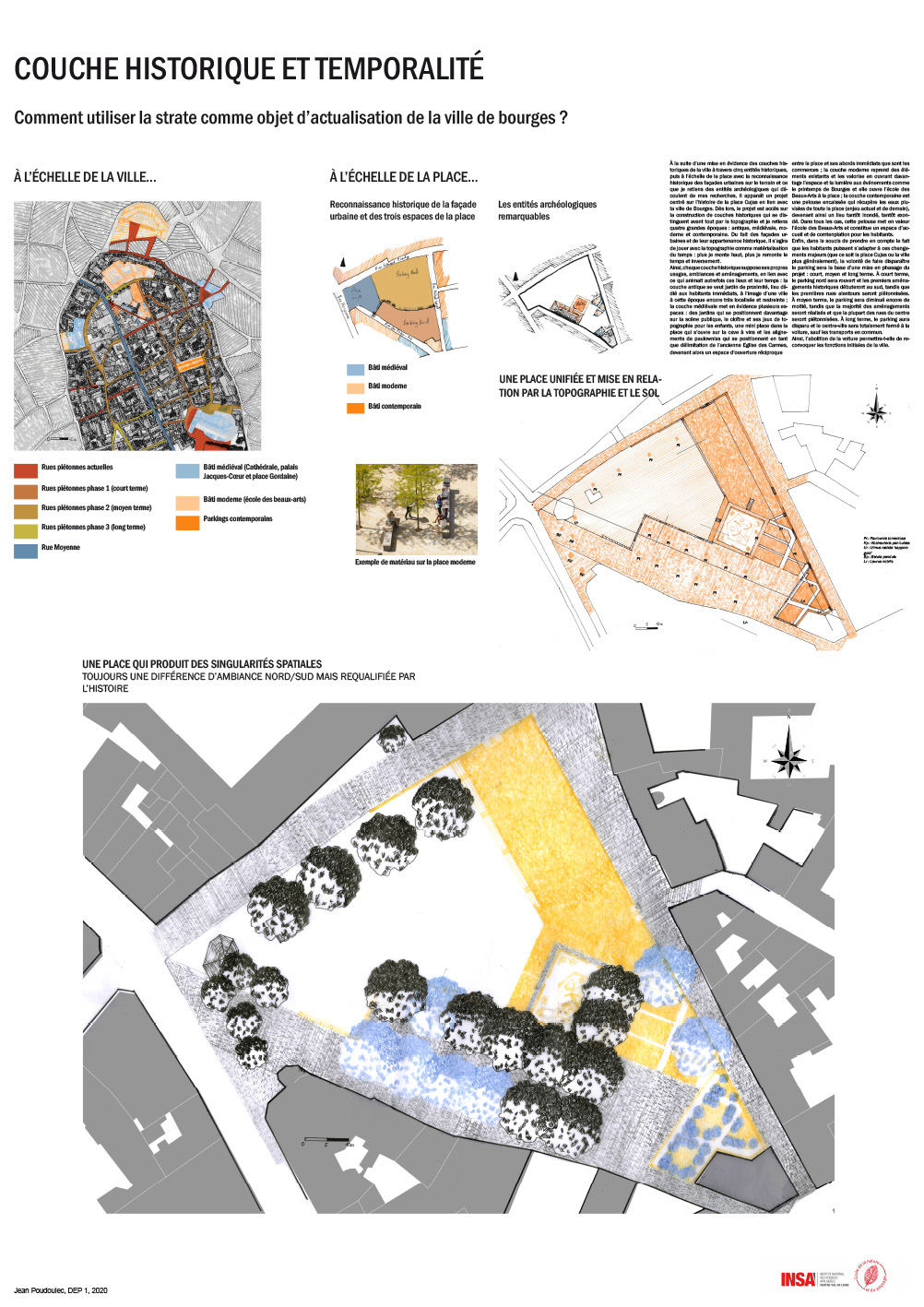 Tous les vendredis, c’est atelier de projet à l’école, pour toutes les promotions. L’atelier de projet en cycle de DEP s’organise autour de conventions que nous établissons avec des partenaires publics ; leurs questionnements deviennent pour les élèves des situations, qui, si elles ne sont pas des commandes réelles, n’en demeurent pas moins des projets réalistes. Partant d’une commande, les élèves et leurs enseignants reformulent les problèmes, définissent une stratégie d’ensemble et répondent collectivement, par autant de propositions de projet de paysage qu’il y a d’élèves, aux questions posées. Récemment, nous avons accompagné la ville de Bourges sur la redéfinition de la place Cujas, la ville de Blois pour un vaste de projet de désimperméabilisation de la ville pour lutter contre les îlots de chaleur urbains, nous avons répondu à la Communauté d’Agglomération de Rochefort pour les soutenir face à la transition énergétique, au Pays des Châteaux (Blois Chambord) pour les aider dans la définition de leur Projet Alimentaire Territorial, à l’Agglomération de Dinan sur leur démarche paysagère agricole, dans le cadre d’enjeux forts d’érosion.