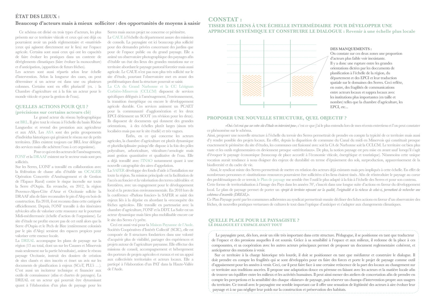 Les espaces où interviennent les paysagistes sont habités, depuis longtemps. Les enjeux sont évidemment humains : comment concourir à organiser des lieux de vie capables d’accueillir une diversité d’usages, une économie de moyens, des acteurs variés aux intérêts parfois divergents ? Afin d’écouter ces échos et de s’en servir comme autant d’arguments de projet, les élèves doivent acquérir une solide culture générale, à propos de l’histoire des villes et des paysages, des enjeux politiques et sociaux, sur les aspects réglementaires, etc. Une curiosité intellectuelle insatiable qui trouve des ressources dans les enseignements mais aussi en dehors, grâce à la bibliothèque de l’école et aux expériences individuelles de chaque élève.